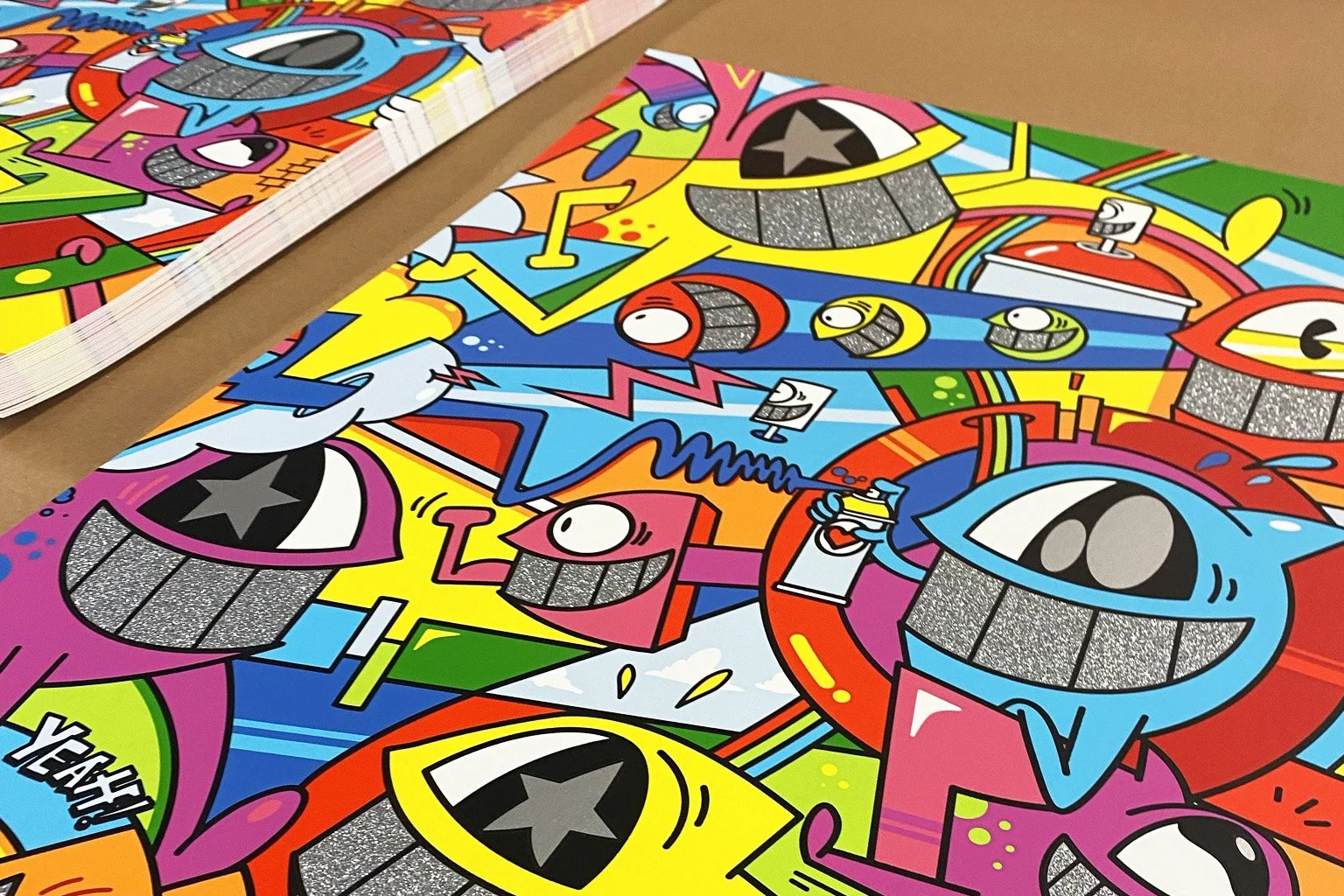 Finishes are where a serigraph truly becomes a collectible. Kolibri offers a wide range of hand-applied effects: including varnishes, gloss accents, matte layers, metallics, pearlescent inks, and textured embellishments. Finishes add dimensionality and presence to the final print. They not only elevate the artwork visually, they also protect the piece and give it the museum-grade quality our clients expect. Whether subtle or bold, each finish is custom-designed to enhance the artist’s style and bring a unique tactile element to the edition.